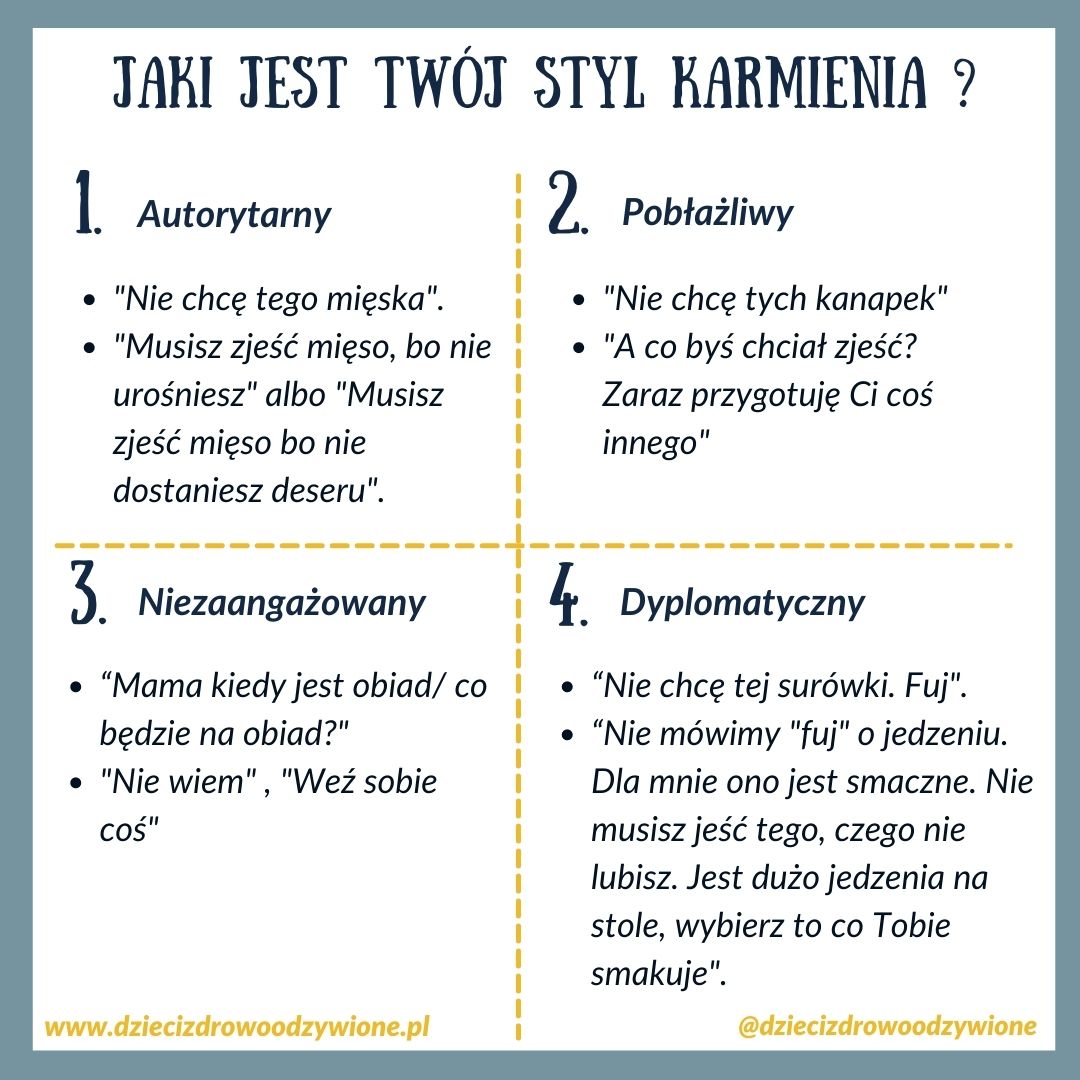 To jest styl, w którym występuje presja. Zazwyczaj objawia się tym, że rodzice nalegają, aby dzieci zjadały wszystko, co mają na talerzu, albo, żeby zjadły z talerza konkretny produkt (np. “zjedz mięso, resztę zostaw”).