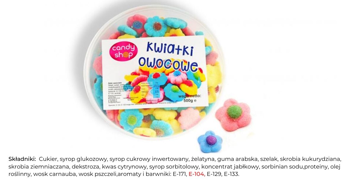No ładne kwiatki… poza tym, że zawierają żółcień chinolową E-104, to jeszcze błękit brylantowy E 133, który też do bezpiecznych barwników nie należy.