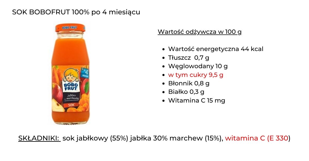 Co prawda na tej butelce jest napisane, że zawiera 2 porcje produktu. Ale nawet jeśli niemowlę po 4 miesiącu życia spożyje zaledwie pół tej butelki (150 ml) to otrzyma równowartość 3 łyżeczek cukru, a to z kolei spowoduje mniejszy apetyt na nowe produkty, które właśnie otrzyma w ramach rozszerzania diety.
