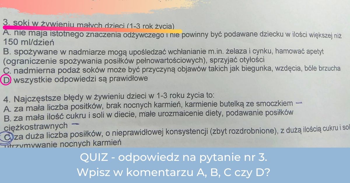 Zrobiłam wczoraj na facebooku mini quiz odnośnie soków w żywieniu małych dzieci. Pytanie pochodzi z prawdziwego egzaminu z Pediatrii z Wydziału Pielęgniarstwa (ale nie powiem na której prestiżowej Uczelni ;-)). Dziękuję za Wasze odpowiedzi – wszystkie były prawidłowe…
