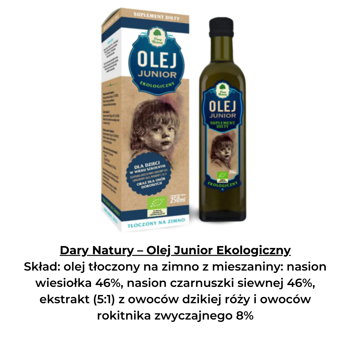 Powstał też specjalny olej dla dzieci w wieku szkolnym – Olej Junior (Dary Natury). Procentowo duży dodatek oleju z czarnuszki nadaje tej mieszance olejowej bardzo specyficzny smak, ale jednocześnie wyjątkowe właściwości prozdrowotne.