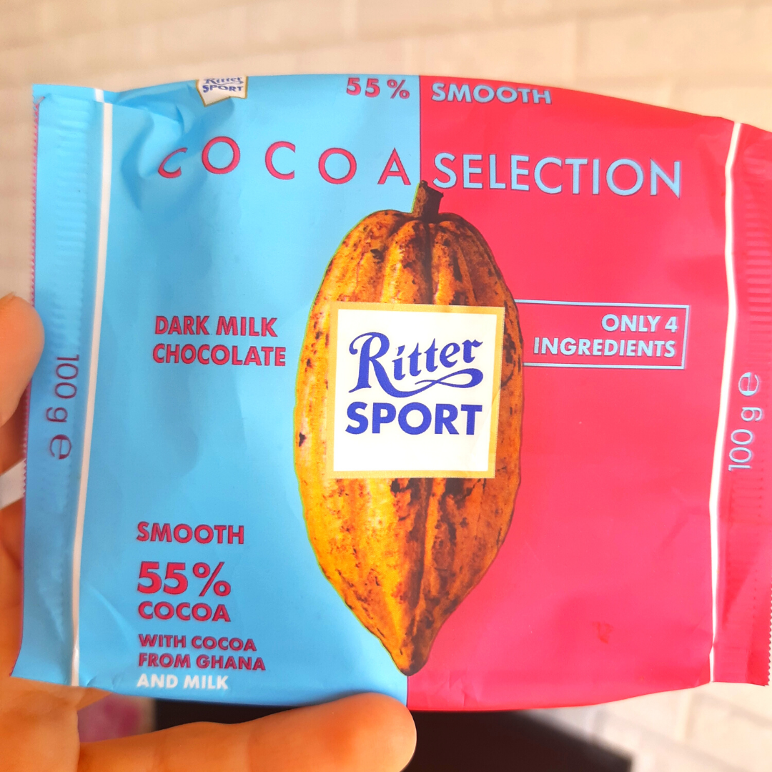 6. Ritter SPORT ciemna mleczna czekolada (55% kakao) – do kupienia m.in. w Lidlu i Biedronce oraz w sklepach internetowych