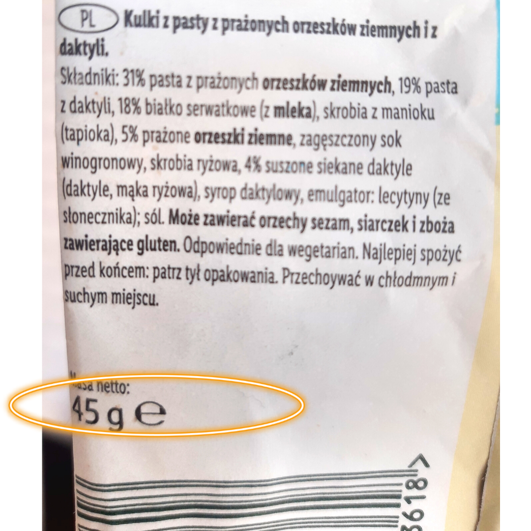 Składniki: 31% pasta z prażonych orzeszków ziemnych, 19% pasta z daktyli, 18% białko serwatkowe (z mleka), skrobia z manioku (tapioka), 5% prażone orzeszki ziemne, zagęszczony sok winogronowy, skrobia ryżowa, 4% suszone siekane daktyle (daktyle, mąka ryżowa), syrop daktylowy, emulgator: lecytyny (ze słonecznika), sól.