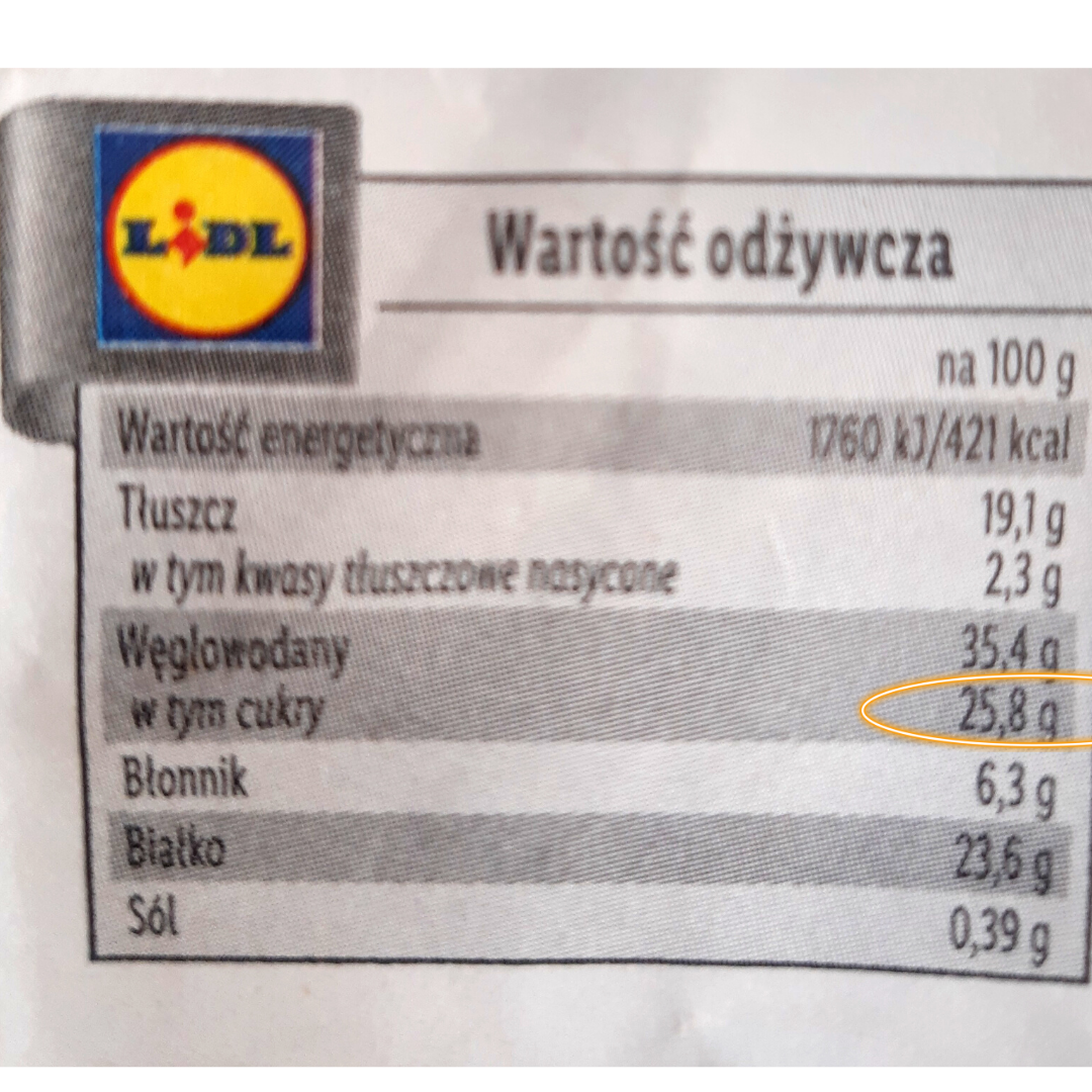 Zawartość cukrów prostych w tym batonie to ok. 10 g, co stanowi równowartość dwóch łyżeczek cukru. W Biedronce można znaleźć jeszcze 2 inne smaki batonów z tej serii orzechowej i one też są ok, bo zawierają relatywnie mało cukrów prostych.